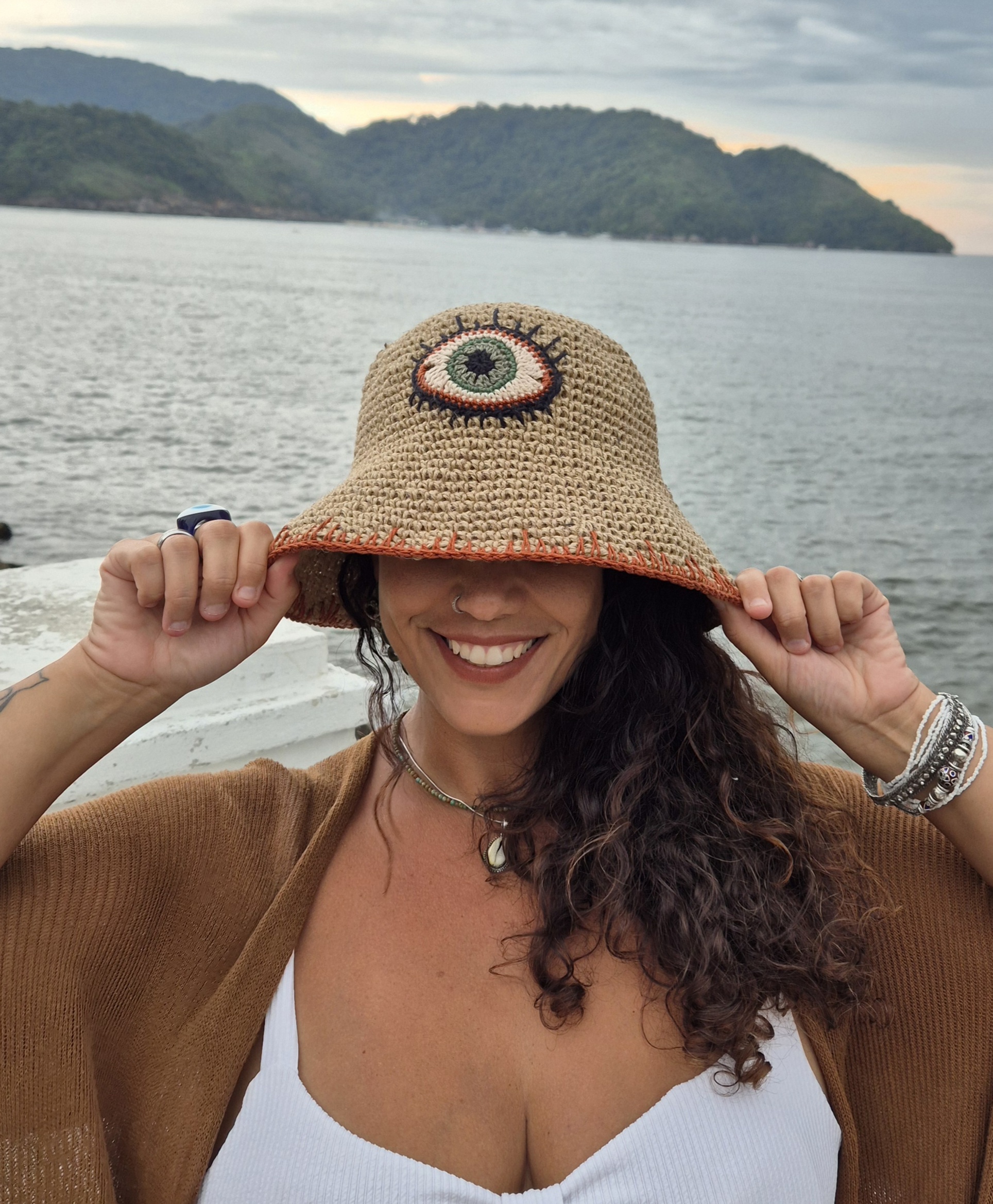Chapéu feito de crochê em fio de fibra vegetal resistente com detalhe feito em crochêe costurado à mão, tamanho padrão adulto feminino. Em caso de medida específica, entrar em contato por WhatsApp e passar as medidas. Prazos e Produção: Oie, gostaríamos de contar sobre como funciona nossa produção. Com o objetivo de trabalhar de forma mais sustentável e por sermos duas artesãs produzindo tudo manualmente, nós não conseguimos ter um estoque dos produtos. Portanto, pedimos um prazo de 10 a 15 dias úteis para a produção de sua peça.Trabalhamos de forma sustentável, ética e slow fashion. Uma nova forma de produzir bolsas e acessórios de moda.