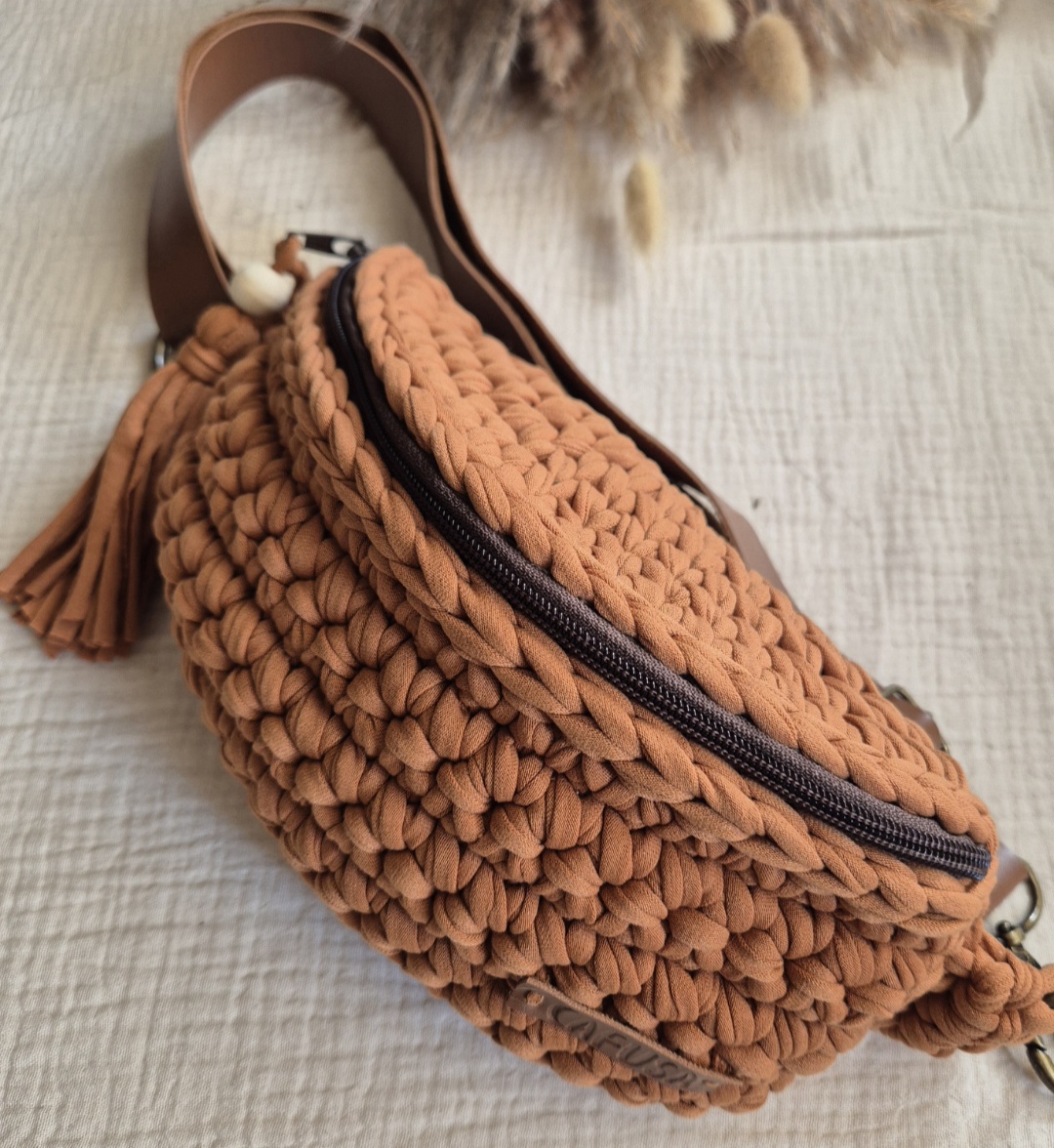 Pochete feita em fio de malha ecológico cor caramelo com ziper e cinto em material sintético caramelo regulável com medida total de 1m10cm de comprimento