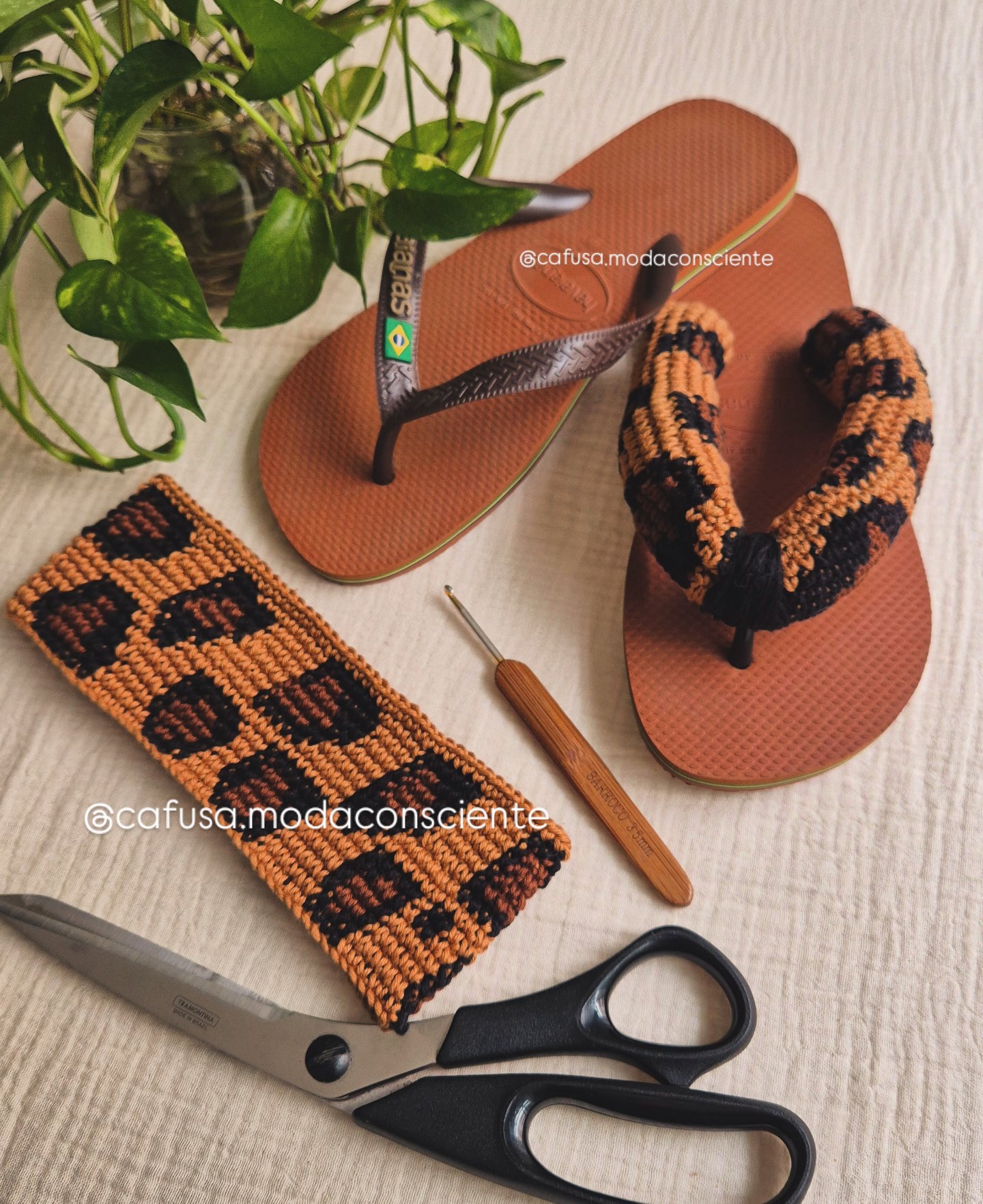 Chinelo havaianas modelo Brasil marrom com tiras forradas em crochê com estampa de onça e enchimento interno. Informar tamanho de acordo com numeração utilizada para chinelo Havaianas. A numeração de opção será sempre o segundo número (Ex.: 39/40 o número para a seleção será o 40)