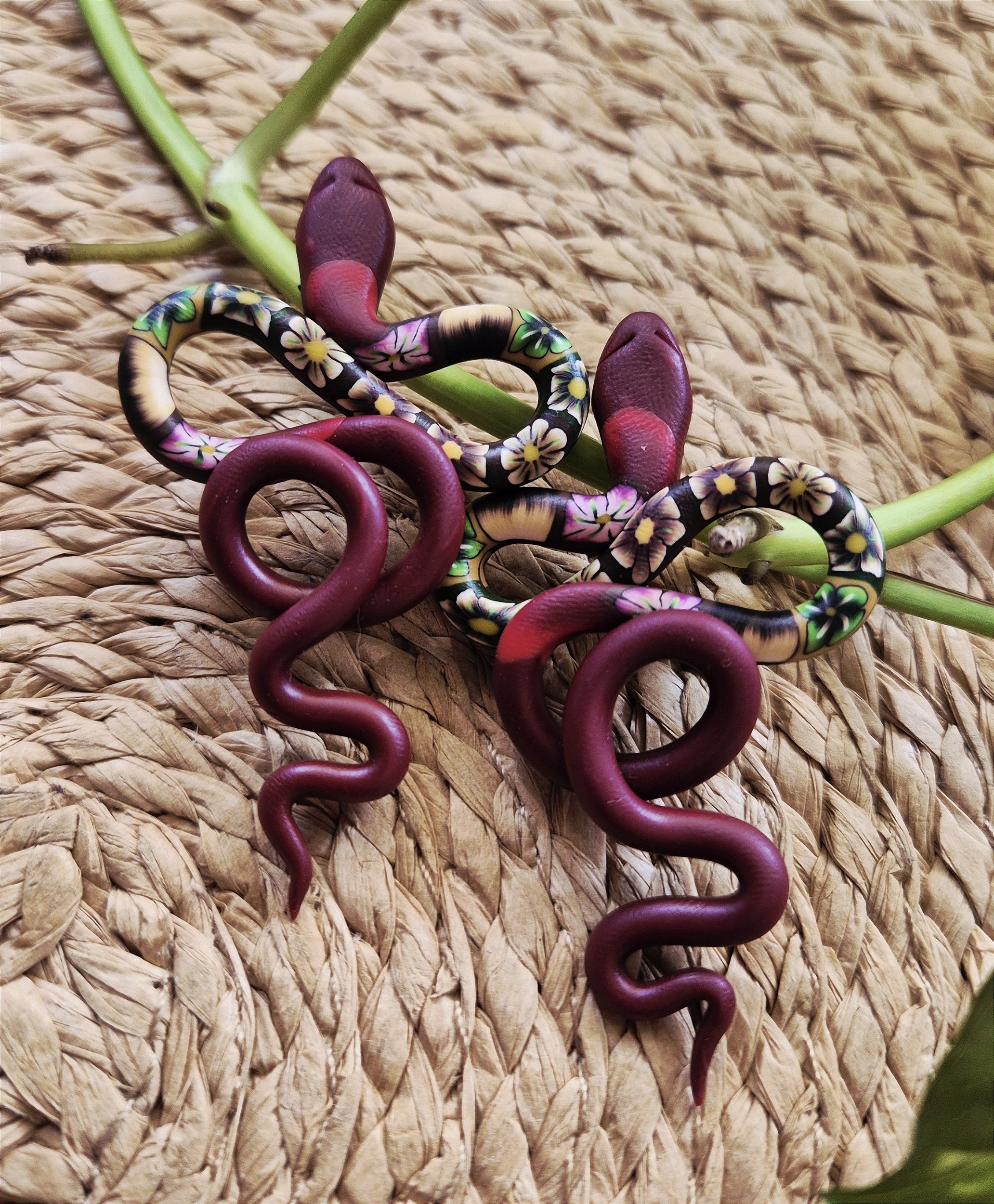 Brincos feitos manualmente em argila de polímero, leves, podem ser molhados em formato de cobra na cor bordô com detalhes em floral.