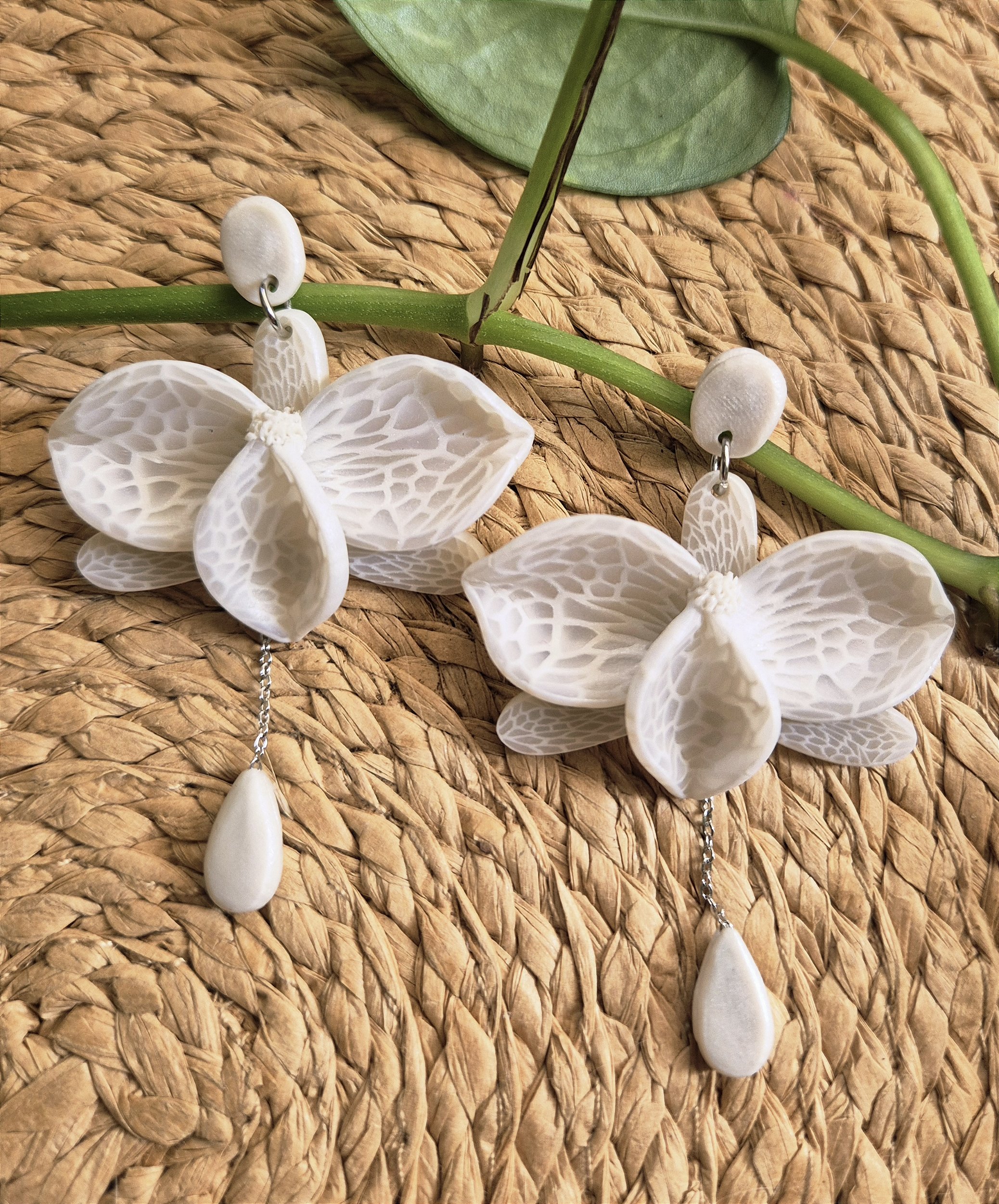 Brincos feitos manualmente em argila de polímero, leves, podem ser molhados em formato de flor orquídea.