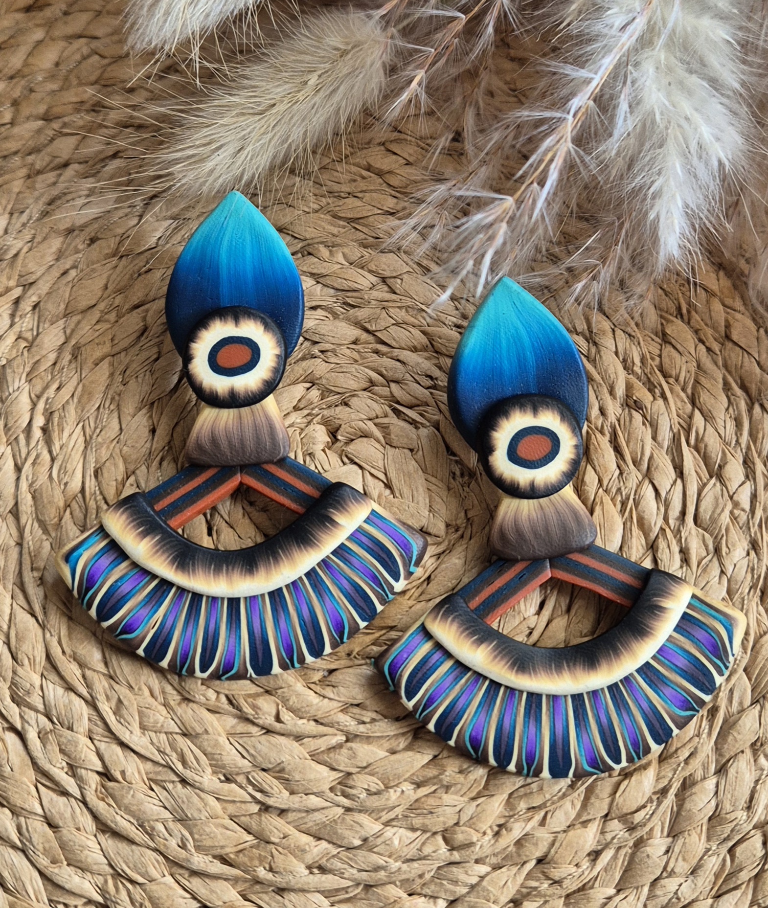 Brincos feitos manualmente em argila de polímero, leves, podem ser molhados em formato de leque com detalhes em marrom, bege, azul e offwhite.