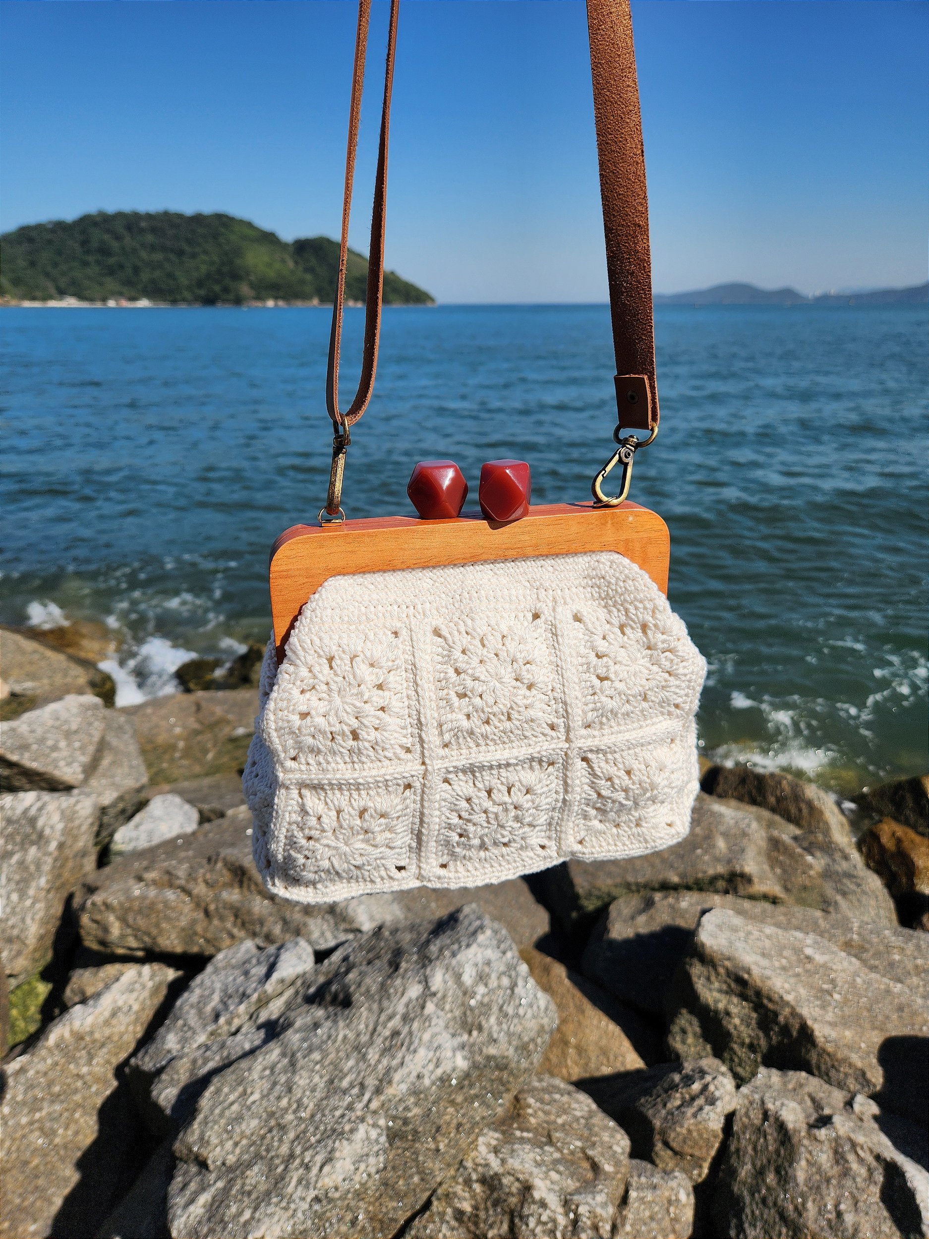Bolsa de crochê em fio de algodão offwhite com forro interno também em algodão e fecho de madeira resistente em imã com detalhe verde.